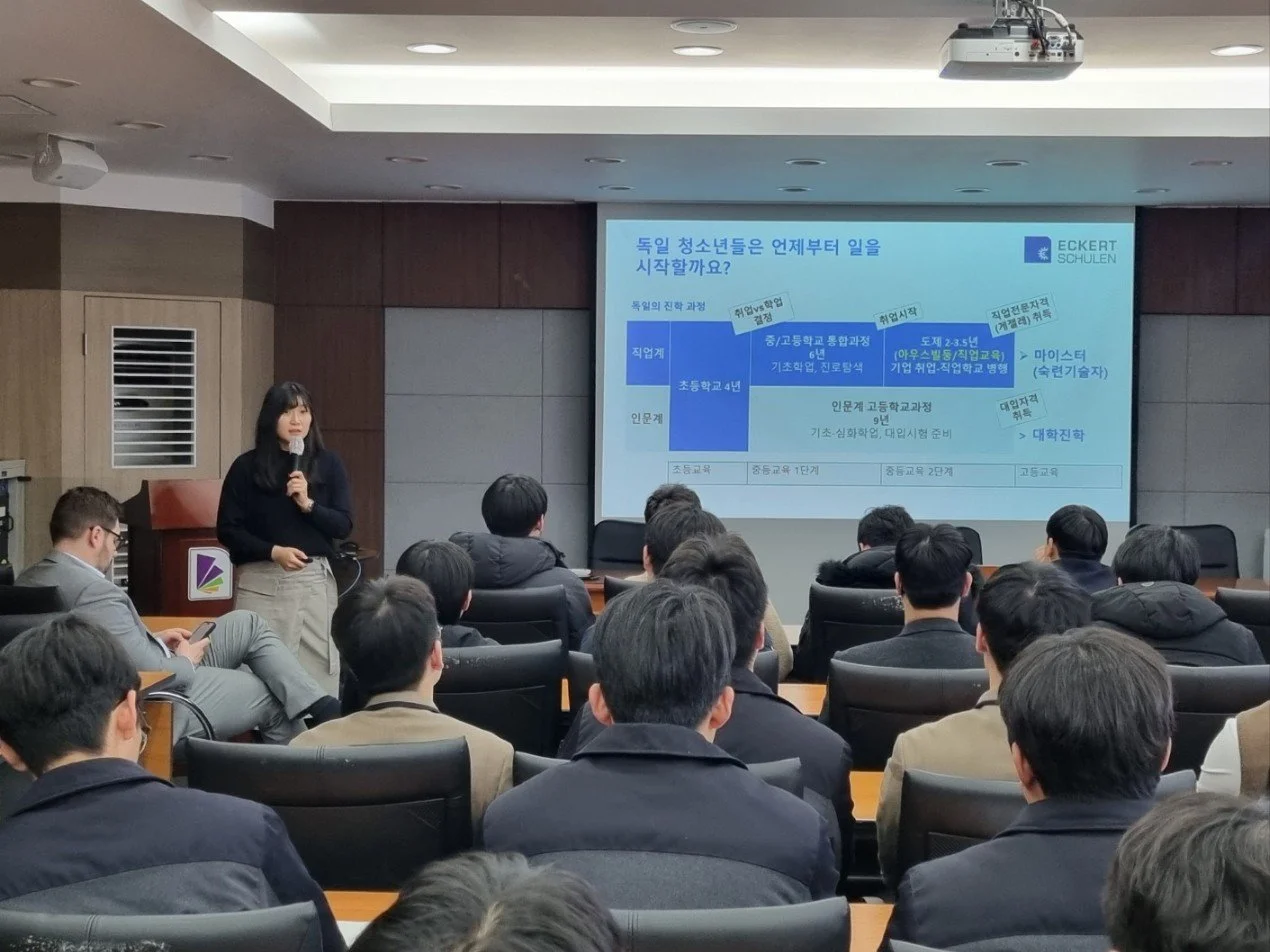 독일의 도제 시스템인 아우스빌둥 Duale Ausbildung 취업에 대한 전문적인 상담을 제공할 수 있는 역량이 있습니다. 독일 마이스터 양성 고등교육기관인 Eckert Schulen의 한국사업 총괄 기업이며, 다수 독일 기업(Lindauer Dornier GmbH, Schott AG, Stadtwerke Oberursel, GROB WERKE, BLUM-Novotest, Liebherr 등)과 아우스빌둥 관련 협력관계에 있습니다.